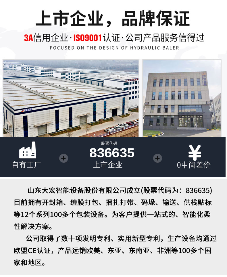 送、開封箱打包、纏繞碼垛捆扎等后道包裝設備,廣泛應用于化工、食品、醫療、電器、造紙紡織、汽車、建材等行業。并通過了ISO管理體系認證,產品通過了歐盟CE認證,2016年3月在新三板成功掛牌上市,股票代碼836635。