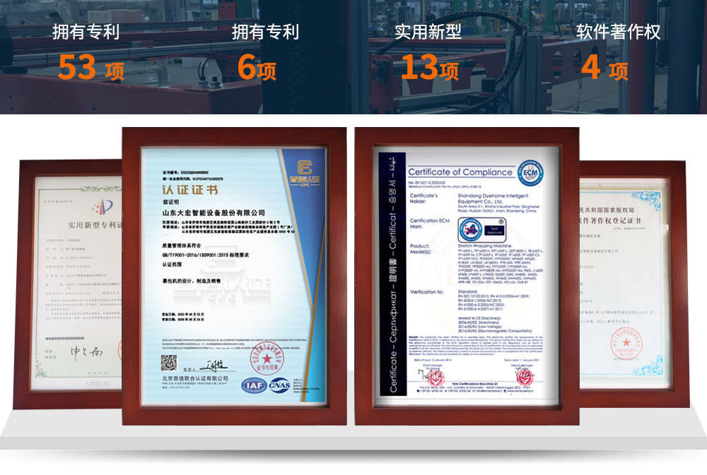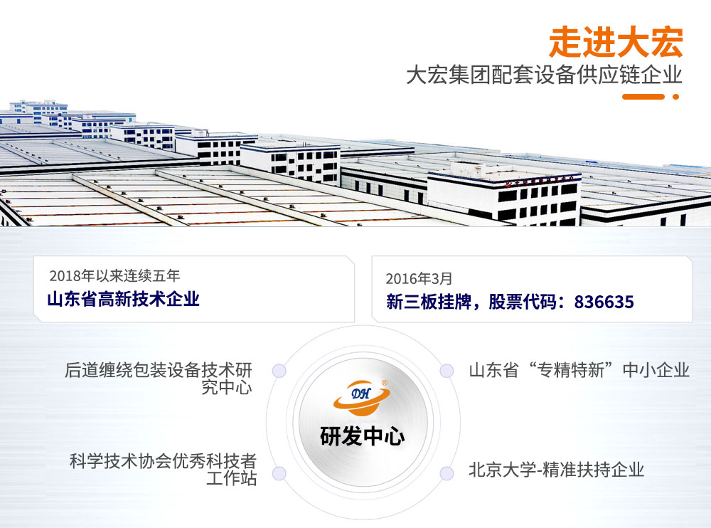 二十余年來,“大宏智能”始終堅持以市場為導向、以客戶需求為中心、以優質服務為根本,致力于高新技術在傳統包裝產業的應用,現有研發人員近30人,與山東省科學院、山東大學、齊魯工業大學等科研院所 和高校建立了長期合作關系,擁有發明專利12項、實用新型專利32項、計算機軟件著作權登記證書18項,已研制成功后道包裝用10大系列、22個品類的包裝設備,包括自動智能纏繞機系列、行業定制纏繞機系列、開箱封箱打包機系列、輸送流水線等,并推出多種組 合解決方案,廣泛應用于造紙、化工、紡織、機械制造、汽車、糧食加工、建材等行業,在化工和新能源領域率先研制成功了提升機、噸包整形機等多種創新設備,自主研發了分體式分揀系統、一體式輸送系統等技術方案,先后被評為“國家級高新技術企業”、“山東 省‘專精特新’中小企業”、“山東省數字經濟‘晨星工廠’企業”、“濟南市瞪羚企業”、“濟南市槐蔭區企事業科協工作先進單位”、“重合同守信用企業”,通過了ISO9001質量管理體系、ISO14001環境管理體系、ISO45001職業健康安全管理體系認證、知識產權管理體系認證和 國家工信部信息化與工業化兩化融合管理體系評定,產品通過了歐盟CE認證,2016年3月在新三板成功掛牌上市,股票代碼836635。