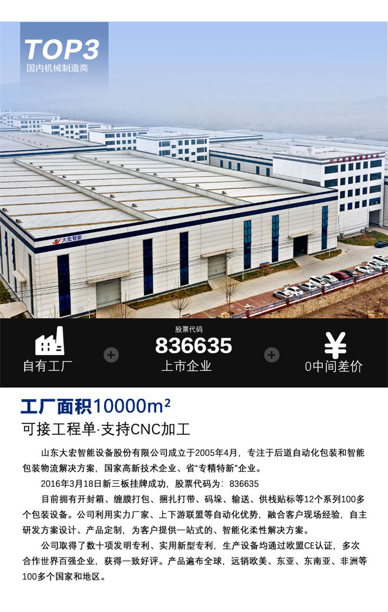 山東大宏智能設備股份有限公司(簡稱“大宏智能”)成立于2005年4月,專業(yè)從事自動化包裝設備的研發(fā)、設計、制造與銷售,并為客戶提供全套后道自動化包裝系統(tǒng)解決方案。