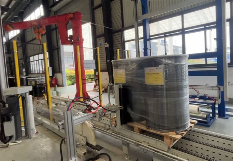 桶裝貨物-搖臂四周纏膜+水平打帶