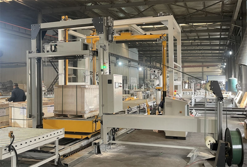 木箱貨物-搖臂式纏膜機(jī)+垂直打帶